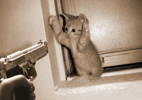 Забавная картинка и стих тоже.))))Но зная кошачью природу хочеться заметить следующее: котенок так смирно выглядит не потому, что пистолета испугался , а потому что они игручие черти, на все кидаются .)))