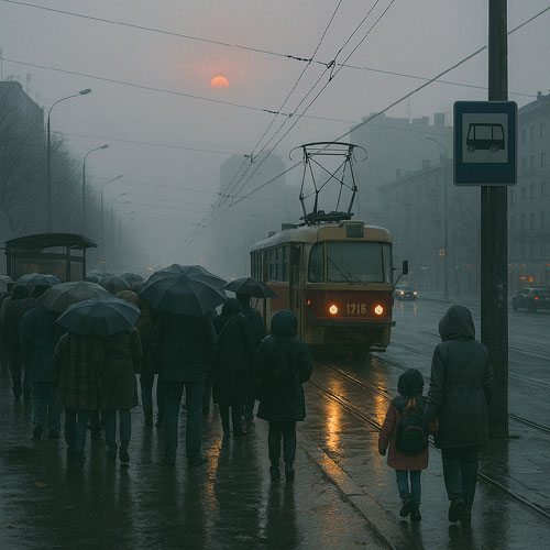 Трамвай, подойдя, проглотил кусочек толпы с остановки. Колёса по рельсам стучат. Позвольте пристроиться с краю? Какое блаженство – молчать, от мира глаза закрывая! Ведут нескончаемый спор за окнами ветер и дождик. Зелёным мигнул светофор, раскрасив стекло как художник. В вагоне дыхание дня – смешение многих испарин. Никто не глядит на меня. За это я вам благодарен.